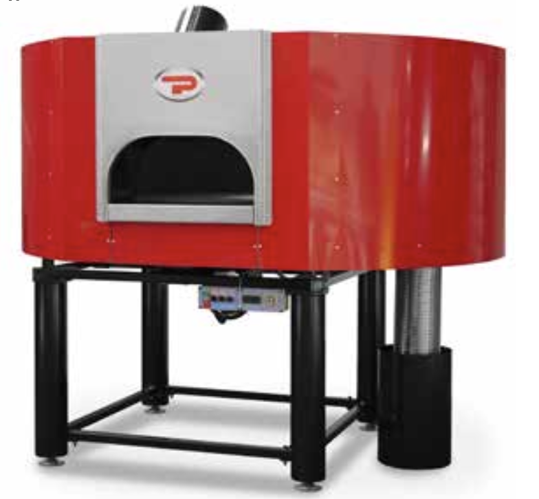PLANO DE COCCIÓN GIRATÓRIO MONOBLOQUE BÓVEDA A CÚPOLA. Este horno de cocción giratorio monobloque presenta un diámetro de 130 cm y funciona a leña, con predisposición para un quemador de gas. Cuenta con una única boca de acceso, leñera y sistema de descarga de cenizas que se puede ubicar a la izquierda, a la derecha o en el centro detrás del horno. El diseño permite una distribución homogénea del calor, con una capacidad productiva que puede superar las 160 pizzas por hora y la posibilidad de cocinar hasta 400 pizzas de manera consecutiva, según datos obtenidos en una pizzería.