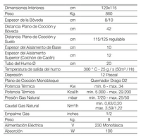 El horno cuenta con un plan de cocción monobloque realizado en un único bloque refractario con un espesor de 7 cm y un peso de hasta 250 kg. Está equipado con un quemador de gas con gestión electrónica, lo que permite la posibilidad de utilizar leña para la cocción. Además, su base dispone de un aislamiento de 15 cm y la cúpula incluye un aislamiento de 10 cm para asegurar una buena retención de calor.