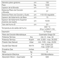 La boca del horno tiene dimensiones de 62x24 cm y es capaz de alcanzar temperaturas de 100° C a 300° C en un tiempo de 45 minutos, utilizando leña seca y un caño aislado de 20 cm de diámetro útil. Este horno pequeño es extremadamente reactivo, lo que permite una rápida recuperación de las calorías cedidas durante la cocción.